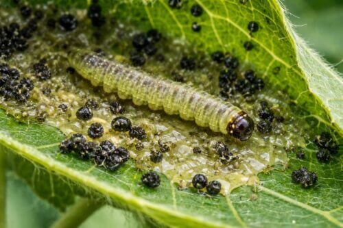 糞は小さな黒い粒や、やや湿った褐色の粒として見つかることがあります。量が多いほど長く潜伏している可能性があり、葉の内側に食べカスのような細かい破片がたまっている場合もあります。糞があるということは、その葉の中が“休憩場所”ではなく“活動場所”になっている証拠です。つまり、すでにそこで食害が進行している状態です。