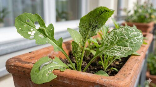 ルッコラやミズナなどのアブラナ科を育てる際に最も警戒すべきがコナガです。成虫は小さな蛾ですが、その幼虫は非常に食欲旺盛で、葉の裏から表皮だけを残して食べる「窓枠状」の食害痕を作ります。また、モンシロチョウの幼虫であるアオムシは、ベビーリーフのような小さな株を一晩で芯だけにしてしまうほどの摂食力を持ちます。これらは放置すると壊滅的な被害をもたらすため、早期の発見が不可欠です。