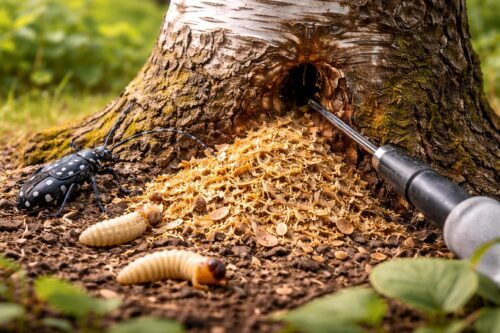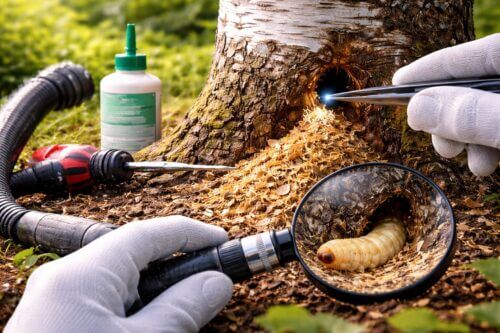 幹の穴や木くずが確認できた場合、幼虫が中にいる前提で対処します。私が重視するのは、穴の位置を特定して、内部へ薬剤を届けるか、物理的に幼虫を処理するかを見極めることです。被害が浅い段階なら対処できる余地がありますが、枝先の急なしおれや複数の穴が出ているなら、すでに被害が広がっている可能性があります。
