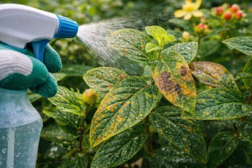 ヒペリカムを栽培していて、最も多くの人を悩ませるのが「葉の変色」です。特に、葉の裏側にオレンジ色や茶色の粉のようなものが付着する「さび病(Rust)」は非常に厄介な病気です。これはカビ(糸状菌)の一種が原因で、胞子が風や雨によって飛散し、周囲の株へと次々に感染を広げていきます。特に秋口の涼しく湿った時期に発生しやすく、放置すると葉が次々と枯れ落ち、最悪の場合は株全体の光合成能力が奪われて枯死に至ることもあります。