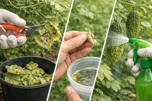 ウリノメイガ対策でいちばん大事なのは、つづり葉が増える前の初動です。被害が軽いうちは、葉を開いて幼虫を取り除く、ひどい葉は切り取る、被害果を除去する、この3つだけでもかなり違います。家庭菜園では、広い面積を一気に防除するわけではないため、初期対応の丁寧さがそのまま成果に直結しやすいです。