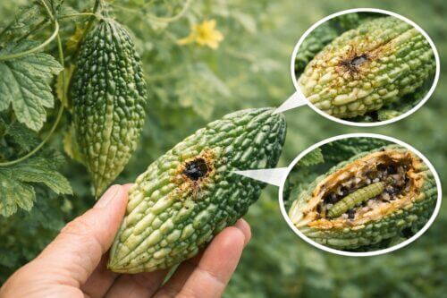 ウリノメイガが厄介なのは、葉だけを食べる害虫ではなく、ゴーヤの実にも被害を広げることです。葉の被害は見た目で済む場合もありますが、実に穴が開くと、収穫量や品質に直接響きます。最初は表面に浅い傷やかさぶた状の跡が見える程度でも、幼虫が深く入り込むと内部が傷みやすくなり、やがて腐敗の入口になります。家庭菜園では「表面の傷だけだから食べられそう」と感じることもありますが、内部まで進んでいる場合は見た目以上に傷みが進行していることがあります。