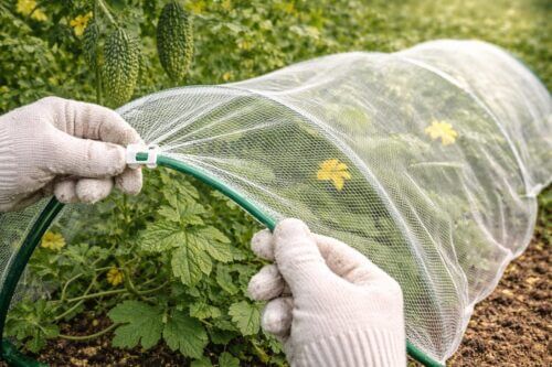 成虫の飛来を止める意味では、防虫ネットが非常に効きます。ウリノメイガは成虫が飛来して産卵するため、発生してからかけるより、発生前から隙間なく使うのが基本です。ネットの目合いが細かいほど侵入は防ぎやすくなりますが、そのぶん通気性が落ちたり、高温時に内部が蒸れたりすることがあります。