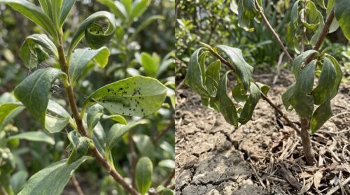 また、アブラムシが排泄する「甘露」は、糖分が非常に高いため、それを餌とするスス病菌が繁殖し、葉の表面が黒い粉状のカビで覆われるスス病を併発させます。これにより光合成能が低下し、沈丁花の活力は目に見えて減退していきます。