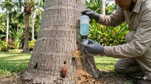 樹幹注入とは、幹にドリルで小さな穴を開け、そこから専用の殺虫剤(スピネトラム剤など)を直接注入する方法です。吸い上げられた薬剤は、ヤシの導管を通じて成長点や新しい葉にまで到達し、数ヶ月にわたって組織内に留まります。