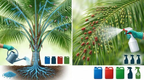 ココスヤシのように背が高く、葉が密集している植物において、薬剤を隅々まで手作業で散布するのは至難の業です。そこで非常に有効なのが、浸透移行性薬剤です。これは、植物自体に殺虫成分を吸わせ、その組織を齧ったり吸汁したりした害虫を退治する画期的な仕組みです。