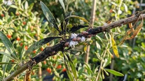 枝にフェルト状のカビが巻き付くこの病気は、樹皮の機能を損ない、深刻な枝枯れを引き起こします。私が見てきた古いクコの木の中には、カイガラムシとこれらの二次病害によって、骨組みだけのようになってしまった株も少なくありません。