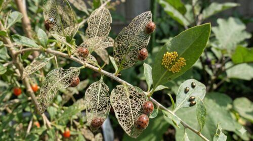 葉が網目状にスケルトン化している場合、犯人はニジュウヤホシテントウ(通称テントウムシダマシ)やハムシ類です。特にテントウムシダマシは、普通のテントウムシとは異なり、葉の表面をかじるように食害するナス科植物の天敵です。私自身の菜園でも、ジャガイモやナスの収穫が終わる頃に、それらから移動してきた個体がクコに大挙して押し寄せる光景を何度も目にしてきました。