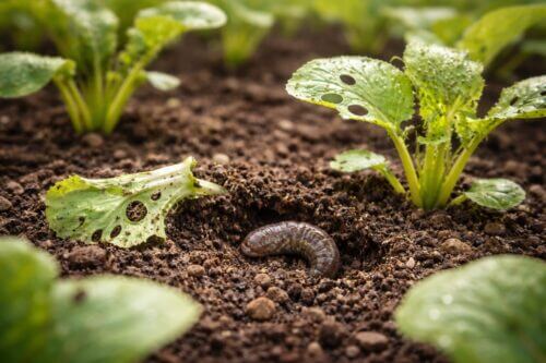 朝見たら昨日まで立っていた苗が地際から倒れている。このタイプの被害なら、ネキリムシを強く疑います。ネキリムシは夜行性で、昼は土の中に潜み、夜に出てきて茎をかじることが多い害虫です。葉に穴を開ける虫と違い、株そのものを使えなくする被害を出すため、少数でも厄介です。発芽がそろって喜んでいたのに、翌朝にはぽつぽつ欠株が出ているときは、かなりの確率で地際の害虫が関わっています。