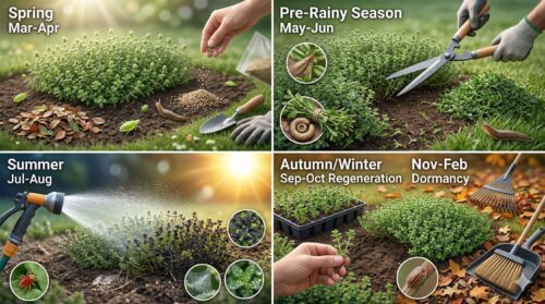 害虫との戦いは、場当たり的な対応では勝てません。季節の移ろいに合わせて、先回りしたケアを行うことが重要です。ここでは、クリーピングタイムを健康に保つための標準的な年間スケジュールをまとめました。