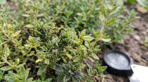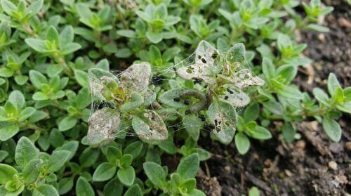 クリーピングタイムの葉が不自然に綴じ合わされていたり、株の中にクモの巣のような白い糸状の物質が見られたりしたら、それは間違いなくベニフキノメイガの幼虫が活動している証拠です。この蛾の幼虫は、タイムやミントといったシソ科のハーブを専門に狙う厄介な存在です。彼らは吐いた糸で複数の葉を接着させ、その内側に隠れながら安全に葉を食害するという、非常に賢い生存戦略を持っています。