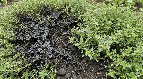 クリーピングタイムの栽培において、最も多くの方が陥る罠が、害虫被害と「蒸れ(生理障害)」の混同です。日本の夏、特に梅雨の長雨から猛暑へと切り替わる時期、密集したタイムの内部はサウナのような高温多湿状態になります。これにより、植物細胞が酸欠や熱ダメージで崩壊し、腐敗していく現象が「蒸れ」です。これは害虫によるものではありませんが、見た目が非常にショッキングなため、多くの人が間違った対処をしてしまいます。