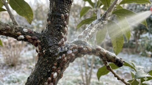 - 冬のマシン油散布でカイガラムシを窒息死させる。