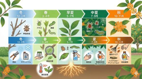 害虫対策において「いつ、何をすべきか」を知ることは、勝負の8割を決めると言っても過言ではありません。金木犀には、特定の時期に特定の害虫が動き出す「バイオリズム」があります。やみくもに薬剤をまくのではなく、このリズムに合わせて狙い撃ちすることが、最も賢く、安全な防除法です。