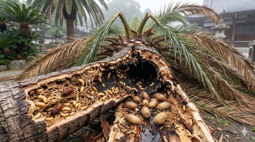メスはヤシの木の成長点付近や、剪定・強風で生じた樹皮の傷口に長い口吻を使って卵を産み付けます。孵化した幼虫は、非常に強力な顎を持っており、植物の繊維状組織をムシャムシャと食い荒らしながら成長します。この際、樹幹の内部には無数のトンネルが掘られ、支持構造が内側から崩壊していくのです。