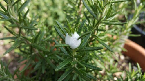 ローズマリーの茎に、まるで誰かが唾を吐いたような「白い泡」が付着していることがあります。これはアワフキムシの幼虫が、乾燥や外敵から身を守るために作り出したシェルターです。泡の正体は、幼虫が排出した液に空気の泡を混ぜたもので、この中に小さな幼虫が隠れて吸汁しています。