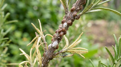 カイガラムシをブラシでこする際、力を入れすぎるとローズマリーの樹皮を傷め、そこから雑菌が入って別の病気を引き起こすことがあります。必ず水で濡らしながら、丁寧に行ってください。