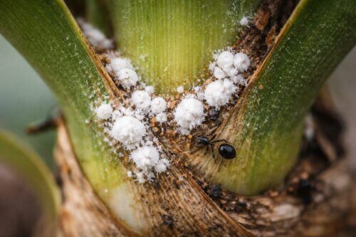 ユッカでよく相談されるのが、葉の付け根や幹の近くに出る白い綿のようなものです。これは高い確率でコナカイガラムシを疑います。見た目は綿クズに近いのですが、実際には虫体や分泌物がまとまっている状態で、触るとわずかに粘り気を感じることがあります。
