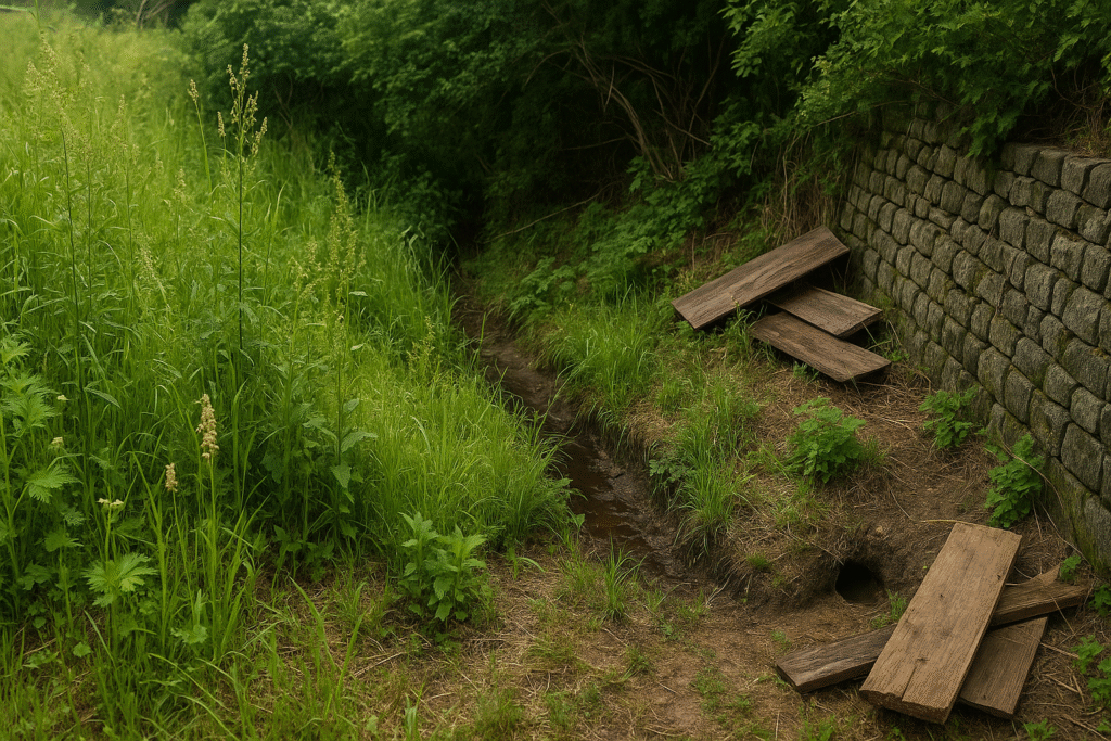 - 古い木材・トタン・園芸資材などが長期間放置され、半分土に埋もれかけている