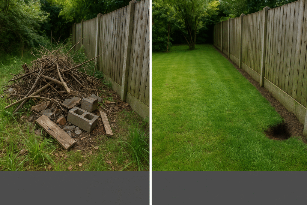 - 落ち葉・資材の撤去:長期間放置された丸太やトタンを片付け、下にできた隙間をなくす。使わない鉢やネットも整理する。