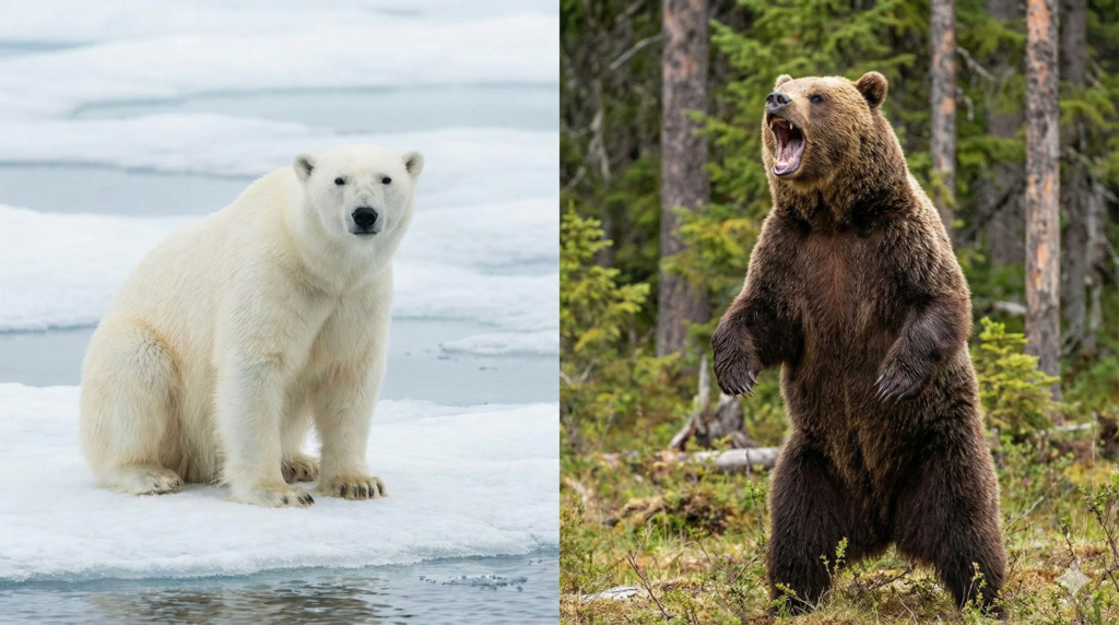まずは、ホッキョクグマとヒグマ(ここではグリズリーなどを含むブラウンベア系)を、体格・筋力・武器・性格といった基本要素から比較していきます。この土台を押さえておくと、後半で登場する「もし戦ったらどちらが勝つのか」という仮想対決のイメージも、かなり立体的になってきます。ここでは、クマ同士の勝敗を冷静に考えるために欠かせない前提条件を、丁寧に整理していきます。