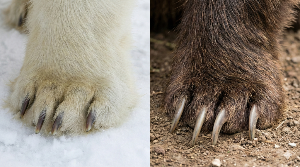 対してホッキョクグマの爪は、ヒグマよりもやや短く太い形状をしていることが多く、氷や雪の上で滑らないためのスパイクとしての役割も担っています。