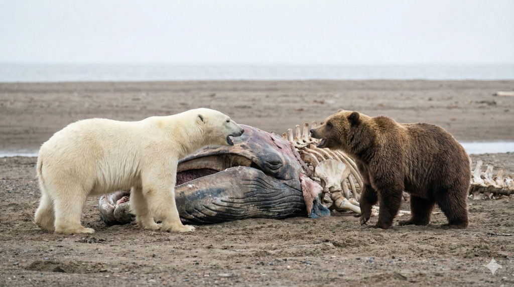 興味深いのは、こうしたエサ場での「駆け引き」です。報告例の中には、体格で劣るはずの若いグリズリーが、より大きなホッキョクグマを威嚇して追い払うケースも含まれています。