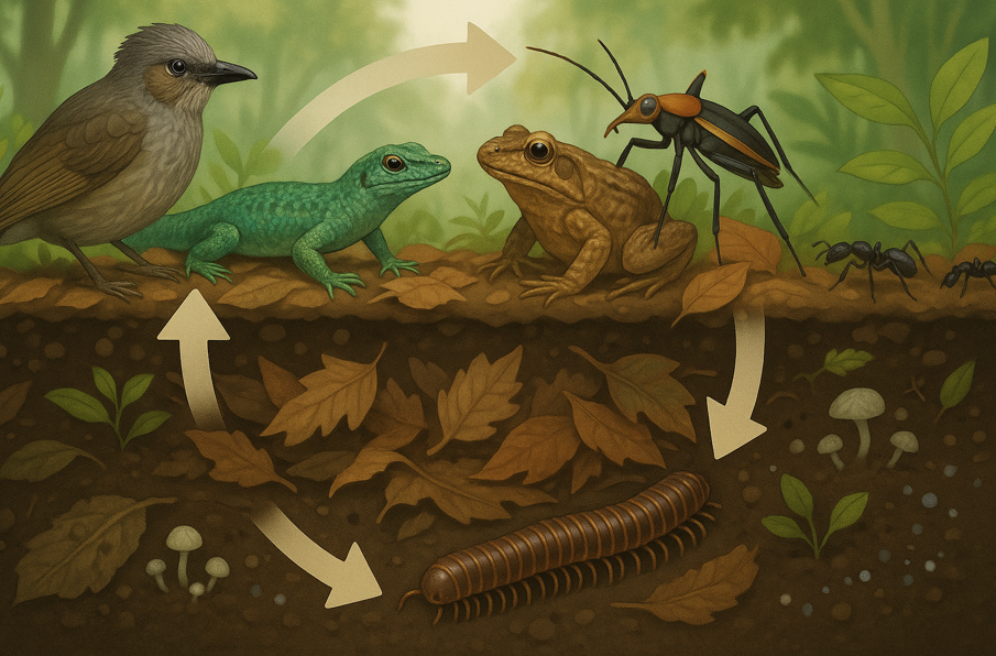 鳥類や小型爬虫類は、森林縁辺や庭園といったモザイク環境で機会的にヤスデを利用し、他の無脊椎動物と合わせて多様なタンパク源として食物網をつなぎます。