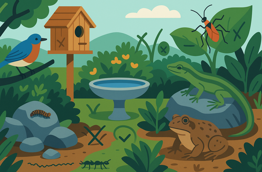 庭での生態的防除は理想的に見えますが、現実には制御性が低く、意図した捕食者だけを継続的に呼び込むことは困難です。
