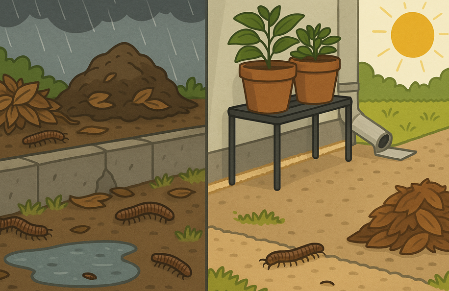 対策としては、排水性の改善、落ち葉・朽木の定期的な除去、鉢や資材の直置きを避ける配置換え、家屋周縁の帯状防除(粉剤や持続型スプレーの活用)が効果的です。