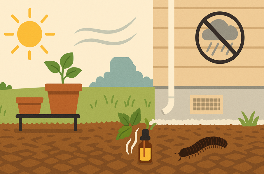 対策としては、排水性の改善、落ち葉・朽木の定期的な除去、鉢や資材の直置きを避ける配置換え、家屋周縁の帯状防除(粉剤や持続型スプレーの活用)が効果的です。