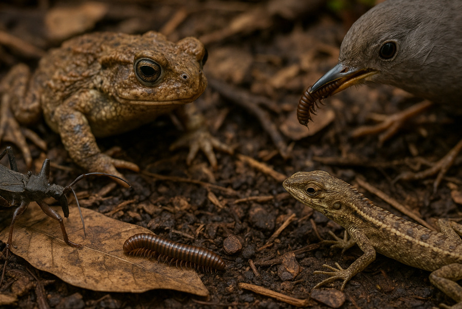 鳥類や小型爬虫類は、森林縁辺や庭園といったモザイク環境で機会的にヤスデを利用し、他の無脊椎動物と合わせて多様なタンパク源として食物網をつなぎます。