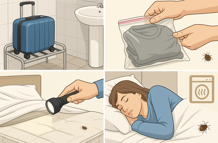 荷物は床やベッドのそばを避け、金属脚のバゲージラックやバスルームなど滑面の上に置くと接触機会を減らせます。