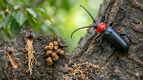 成虫は6月から8月にかけて活発に動き回り、樹皮の隙間に数百度もの卵を産み付けます。成虫自体の姿も特徴的で、体長は3センチから4センチほど、体全体は光沢のある黒色ですが、首にあたる前胸部が鮮やかな赤色をしています。この毒々しい配色は一度見れば忘れないはずです。
