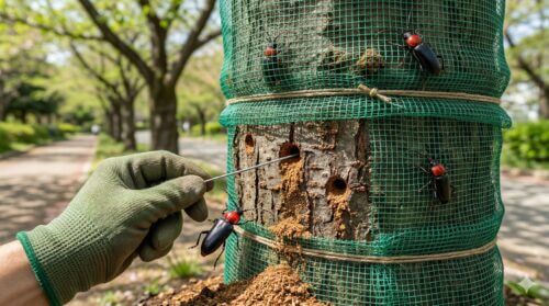 また、最近では成虫を誘引して捕殺するトラップや、粘着シートを幹に巻き付ける方法も研究されています。しかし、最も強力な武器は管理者の「目」です。毎日木を観察し、新しいフラスが一つでも落ちていないかチェックすること。この初期対応の早さが、木の生死を分けます。