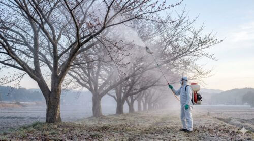 薬剤散布は、害虫が発生してから行う「駆除」と、発生を未然に防ぐ「予防」の2つの側面があります。河津桜を美しく保つプロが最も重視するのは、休眠期に行う「冬季防除」です。1月から2月頃、葉が落ちて木が眠っている間に「石灰硫黄合剤」や「マシン油乳剤」を散布します。これにより、樹皮の隙間で越冬している害虫の卵や、病原菌の胞子をまとめて死滅させることができます。