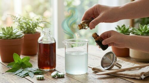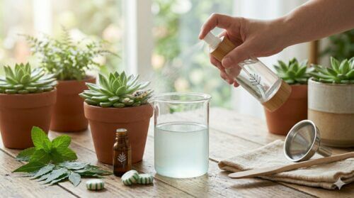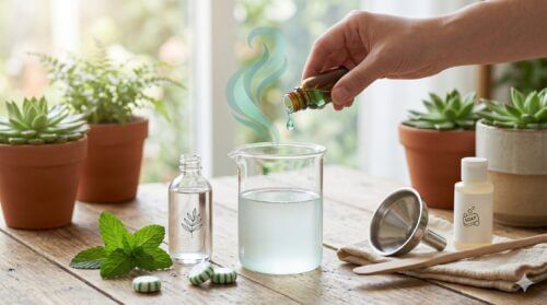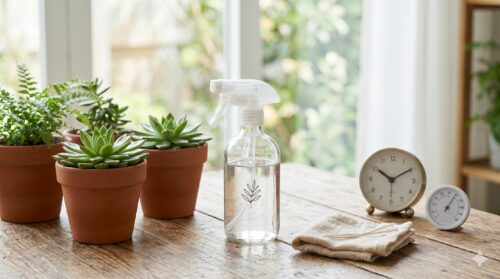 作り方は簡単で、まず無水エタノール10mlにハッカ油を5〜10滴ほど垂らしてよく混ぜます(ハッカ油は水に溶けにくいため、先にアルコールと混ぜるのがコツです)。そこに液体石鹸を数滴加え、最後に水90mlを注いで希釈します。この「ハッカ油アルコールスプレー」は、殺虫・忌避・清掃の三役をこなし、家の中でも安心して使える天然由来の防除剤として重宝します。使用前には分離を防ぐため、軽くボトルを振ってからスプレーしてください。