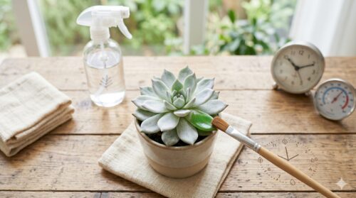一度アルコールで剥げてしまった粉は、その葉が寿命を迎えるまで二度と再生しません。粉が溶けると葉の表面に「指紋がついたような跡」や「黒ずみ」が残り、自慢のコレクションの美観を永久に損なう恐れがあります。また、保護膜を失った部分は直射日光に弱くなり、そこから深刻な葉焼けが広がる原因にもなります。多肉植物にカイガラムシがついた場合は、全体にスプレーするのではなく、アルコールを含ませた細い筆や綿棒で、虫だけをピンポイントで狙い撃つ技術が求められます。