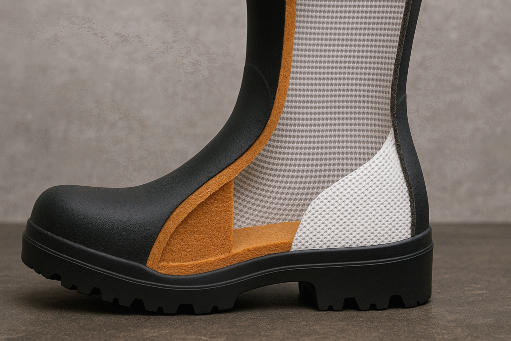 マムシ用長靴は、この相反する要求を両立させるために、複数の素材やゴムの硬度を組み合わせて設計されています。