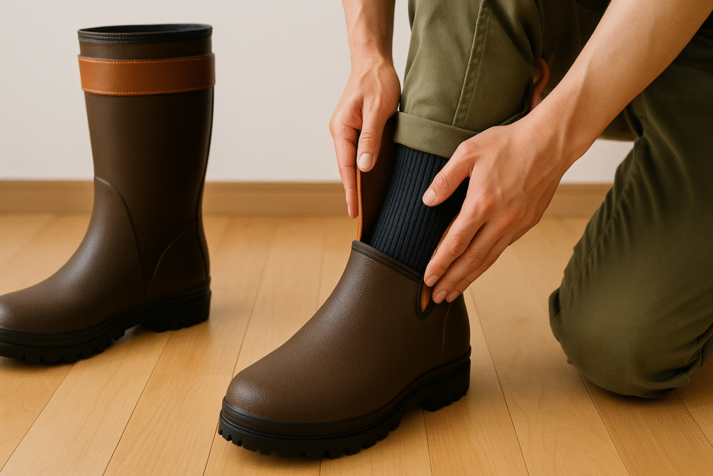 長靴の中には新聞紙や乾燥剤を軽く入れておくと、湿気やニオイを抑えやすくなります。