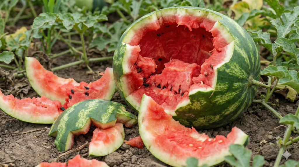 家庭菜園で特に多いのが、割れたスイカや小玉、収穫しきれなかった果実を「どうせ捨てるなら畑の端に置いておこう」というパターンです。