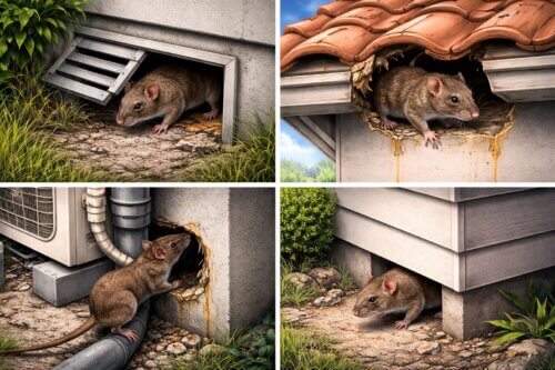 1階と2階の間にネズミが入るまでには、屋外から建物内へ入る入口と、壁内や設備まわりを移動するルートの両方があります。よく見落とされるのは、配管の貫通部、エアコン配管の穴、基礎まわりのすき間、換気口まわり、外壁の劣化部です。築年数が進んだ住宅では、施工当時は塞がれていた部分が経年でゆるみ、小さなすき間になっていることがあります。新築や築浅でも、設備工事後の埋め戻しが甘いと入口になり得ます。