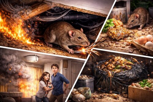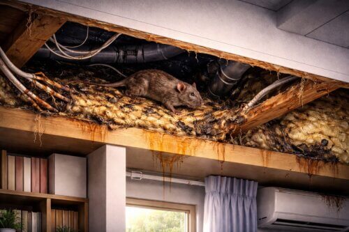 階間にネズミがいると、単に音がうるさいだけでは終わりません。天井や壁の内部では、糞尿の蓄積、断熱材の破壊、ダニの発生、配線のかじり被害が起こることがあります。とくに配線まわりは見えない場所で傷むため、気づいたときには被害が広がっていることがあります。