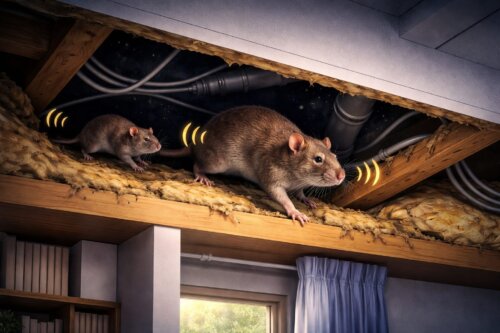 1階と2階の間は、人が普段出入りしないうえに、暗く、温度が安定しやすく、断熱材もあるため、ネズミにとって非常に都合のよい空間です。とくにクマネズミは警戒心が強く、乾いた高所を好む傾向があるため、階間や天井、壁内は格好の潜伏場所になります。外敵や人の気配を避けられ、なおかつ近くに配線や配管という移動の支点があるため、活動しやすい条件がそろっています。