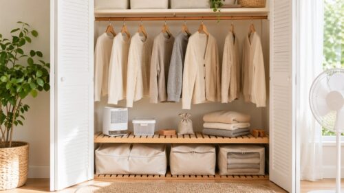 また、収納する際の密度も考慮してください。衣類をパンパンに詰め込むと、空気の層が停滞し、クローゼットの隅に「湿気の溜まり場」ができてしまいます。収納量はクローゼットの容量に対して8割以下に抑え、衣類と衣類の間を風が通り抜けるスペースを確保してください。