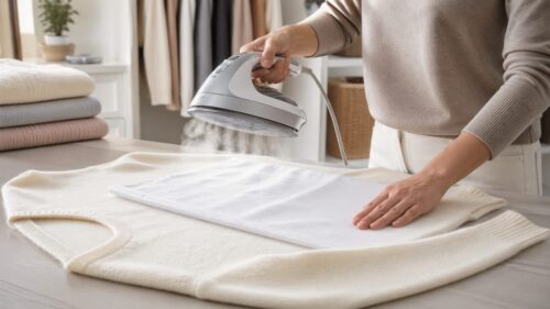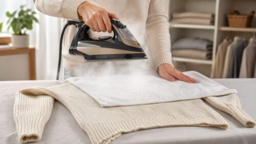 その後、軽くすすいで(シリコン成分を少し残すのがポイントです)、バスタオルで水分を取り、元の型紙や同じサイズの服を参考にしながら形を整えて平干しします。最後にアイロンのスチームを当てることで、繊維の形状がさらに安定します。完全に元通りとはいかないまでも、この方法で「着られるレベル」まで回復できるケースは多々あります。