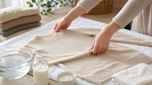 手順は簡単です。30℃程度のぬるま湯に、コンディショナーを2〜3プッシュほどしっかり溶かし、縮んだセーターを30分間浸け置きします。成分が繊維の奥まで浸透したら、水中で優しく、元のサイズに戻すイメージで縦横に引き伸ばしていきます。このとき、一箇所だけを強く引っ張るのではなく、全体を均等に伸ばすのが美しく仕上げるコツです。