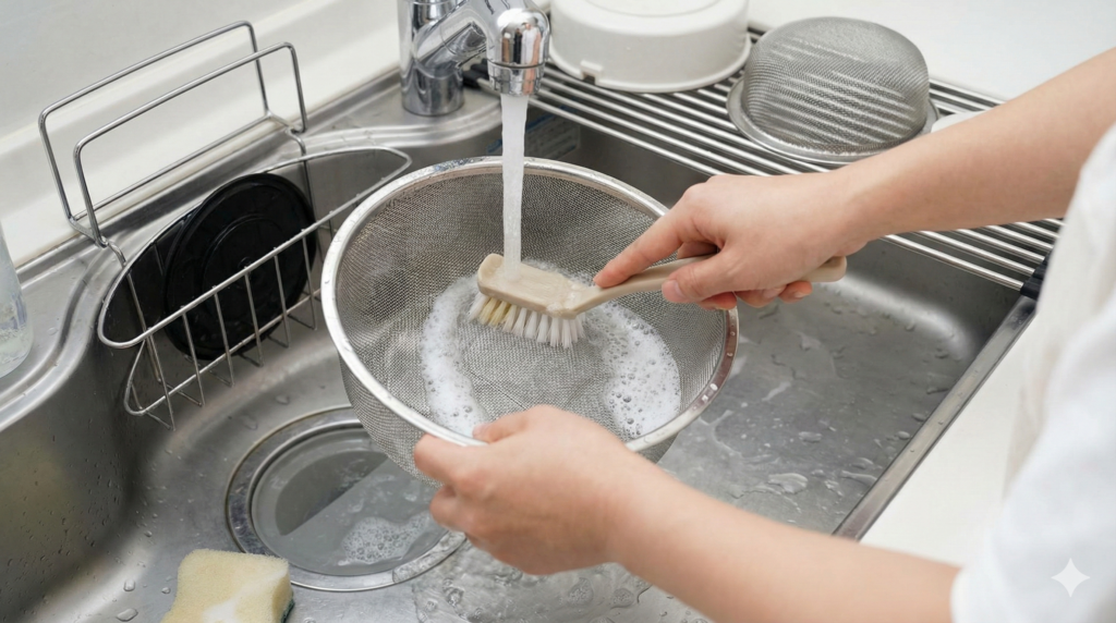 歯ブラシや小さめのブラシで、網目に沿ってこする。力任せではなく、角度を変えながら少しずつ掻き出すのがコツです。