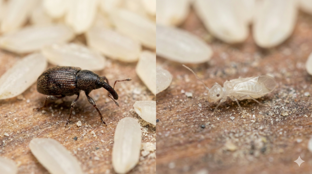 コクゾウムシは黒っぽい小型の甲虫として見えることが多い一方、チャタテムシはさらに小さく、白〜半透明っぽく見えることが多いです。