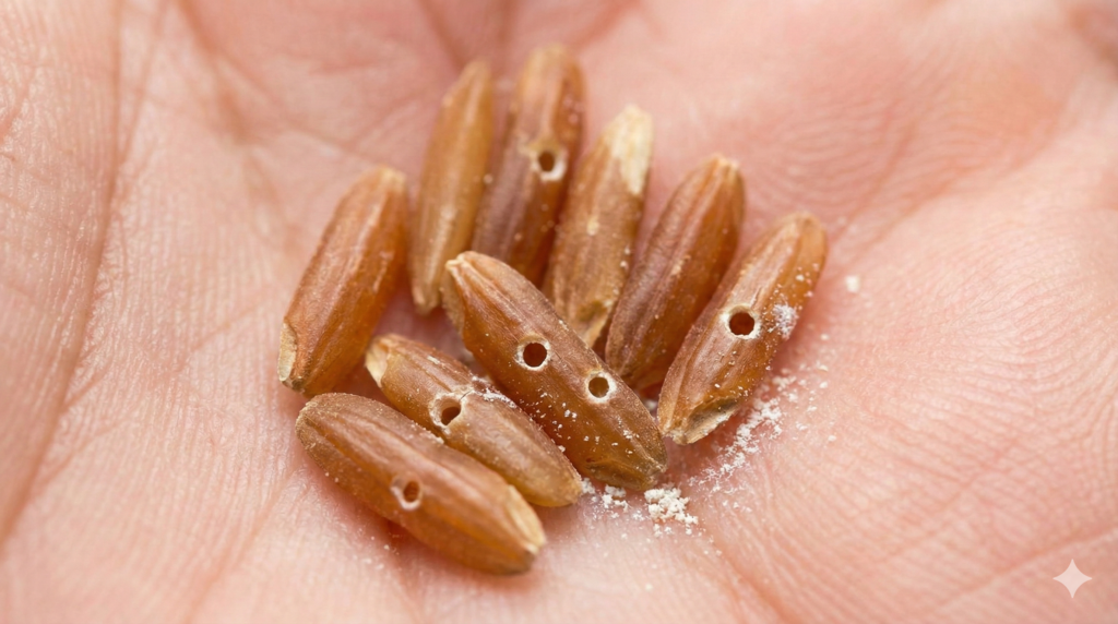 コクゾウムシは米粒に産卵し、栓のように塞ぐため、外見で判別しにくいことがあります。表面がきれいでも、温度条件が整うと後から出てきます。